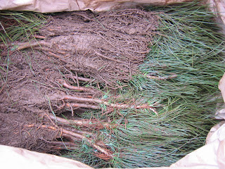 The weather was perfect for planting - perfect for the trees, that is. The temperature was in the 50s, but most importantly, it was overcast and drizzling all afternoon. The roots on young tree seedlings can dry out very quickly if exposed to sun, heat or dry air, and this day was lacking in all three.